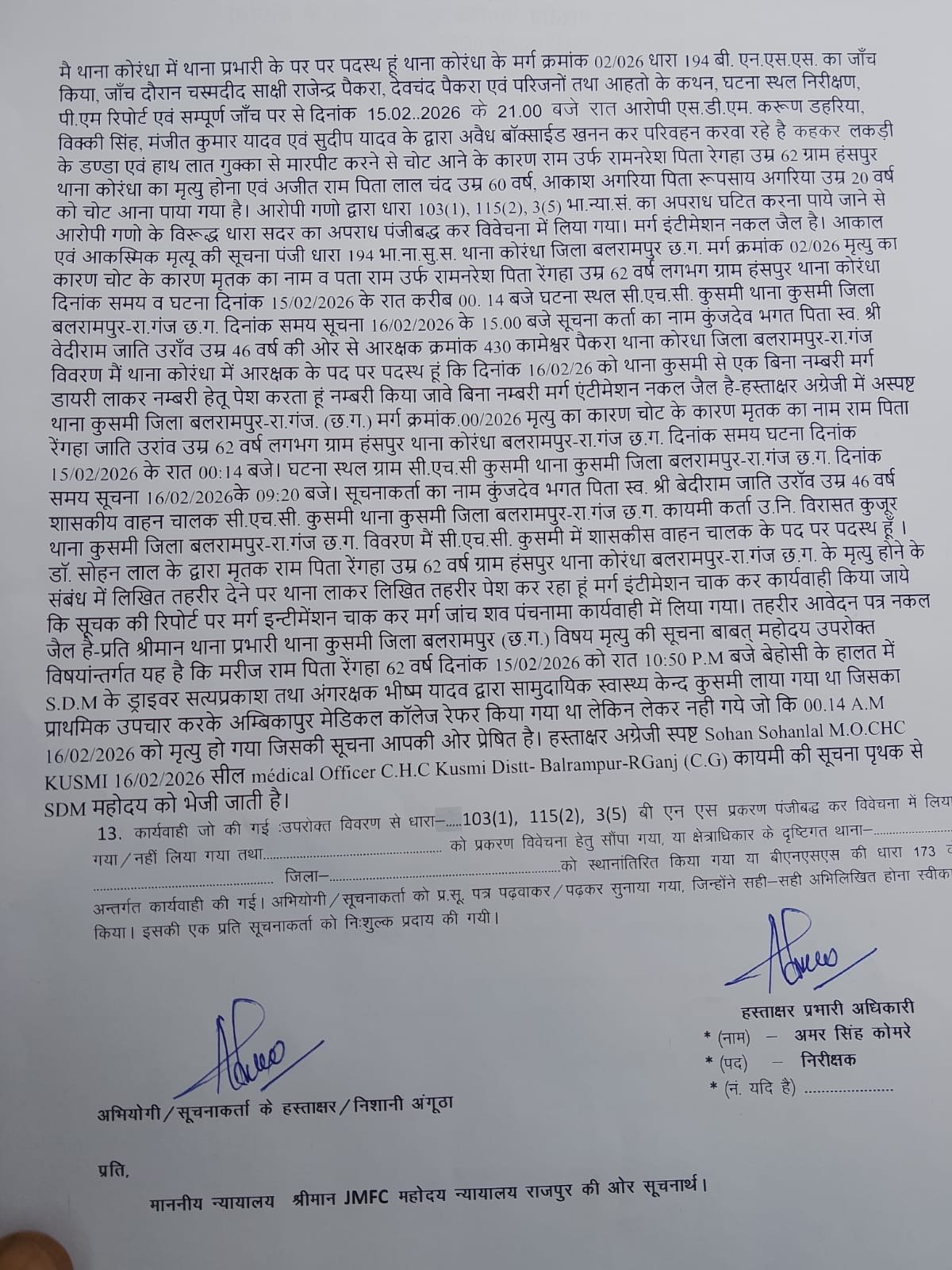 अम्बिकापुर- बलरामपुर जिले के कुसमी के हत्यारोपित SDM करुण डेहरिया और उसके तीन गुर्गों को बुजुर्ग की हत्या के मामले में गिरफ्तार कर लिया गया है। घटना के बाद से इलाके में तनाव का माहौल था वहीं सर्व आदिवासी समाज ने धरना प्रदर्शन कर आरोपियों के खिलाफ कठोरतम कार्यवाही की माँग की थी।