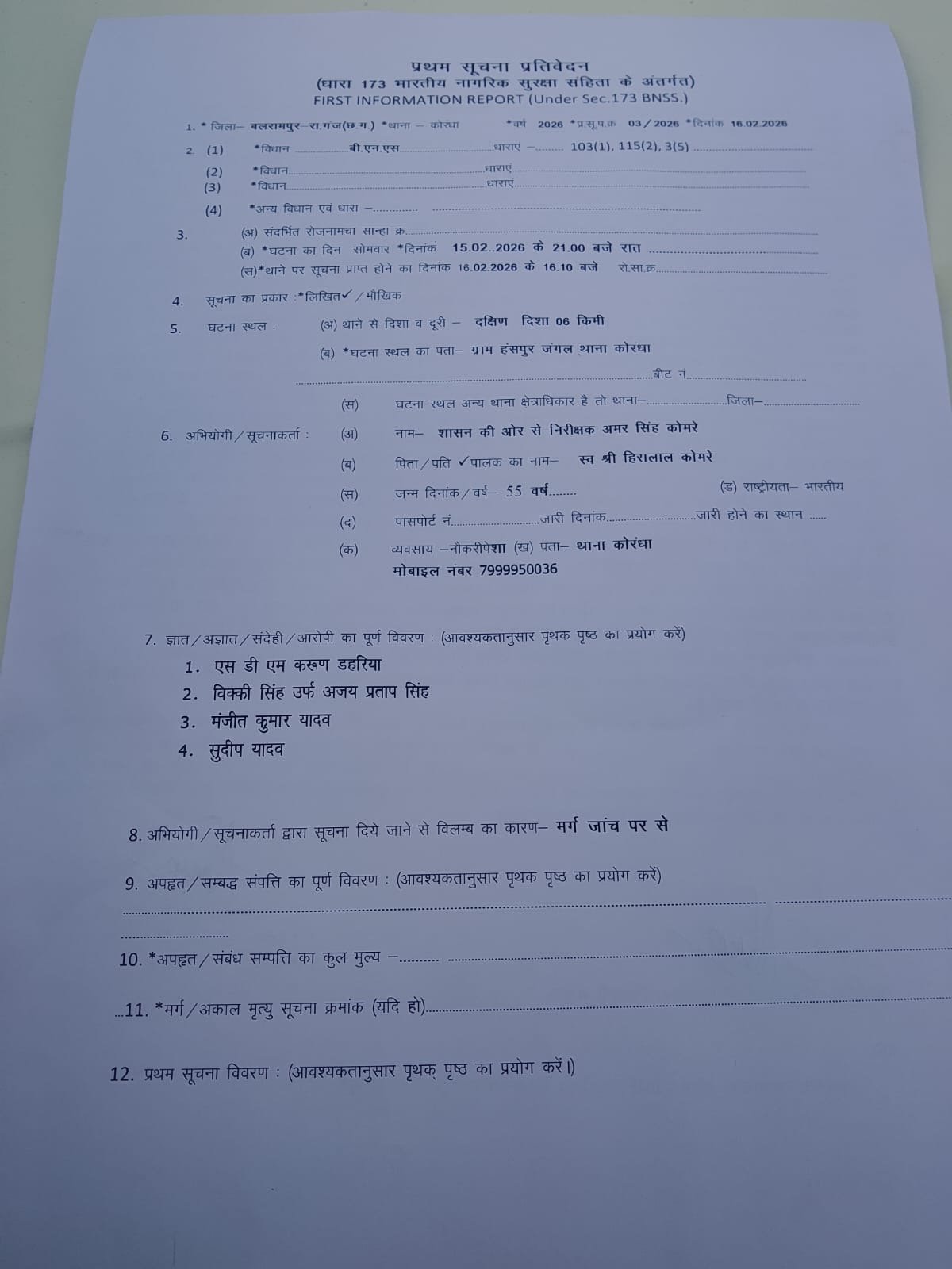 मामले की जानकारी देते हुए एसपी बलरामपुर वैभव बैंकर ने जानकारी दी है कि मामले में एसडीएम करुण डहेरिया, अजय सिंह उर्फ़ विक्की,मंजीत यादव और सुदीप यादव को गिरफ्तार कर न्यायालय ले समक्ष पेश किया जा रहा है।
